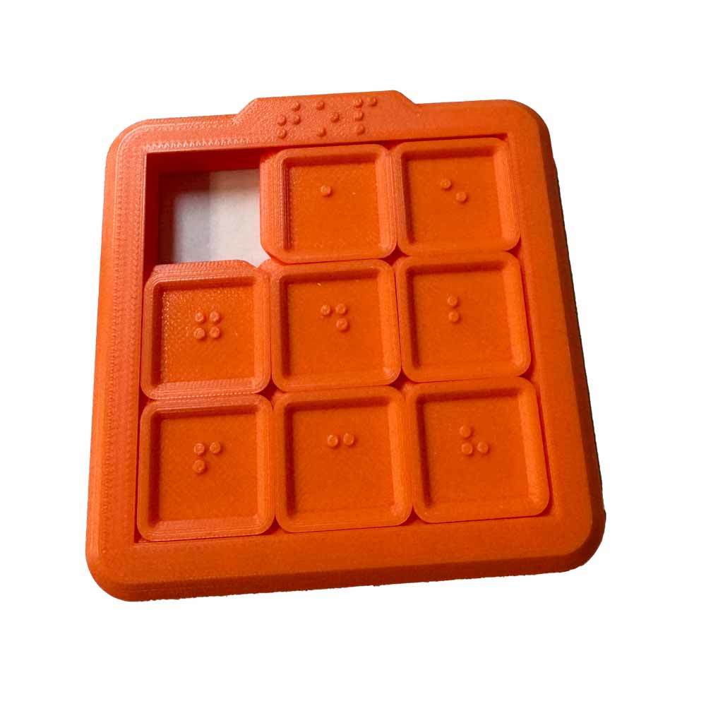 3x3 inch, sliding Plastic puzzle game with raised Braille dots.