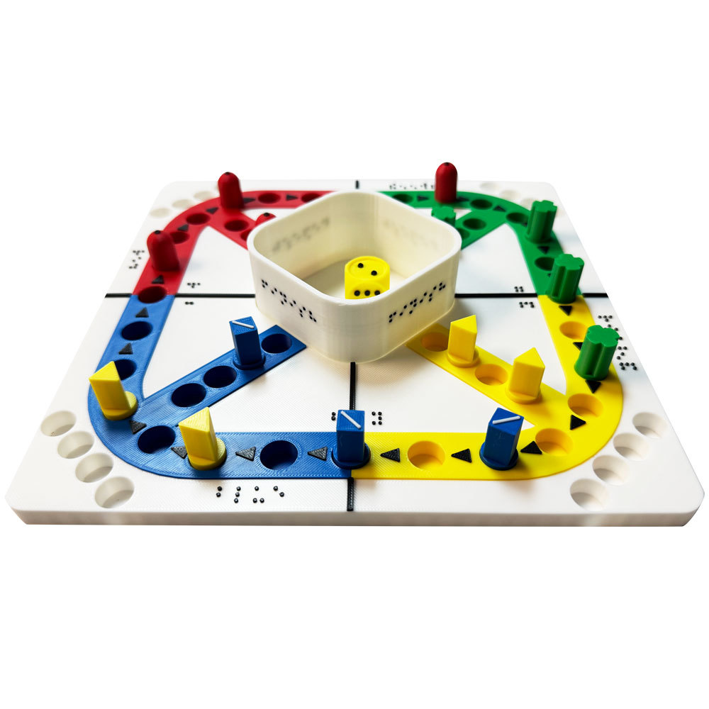 Troubraille is a classic board game that has been adapted for the blind and can be played by 4 players (sighted or blind). Each player chooses a color and has uniquely shaped pegs. Green cross, yellow triangle, red circular, blue square. The object of the game is to roll a tactile dice in to the "bowl" and move their pegs clockwise around the board eventually moving to the finish area where they are safe. If one of your pegs "land" on another peg, you send their peg back home!